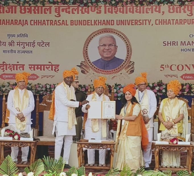 छतरपुर के महाराजा छत्रसाल बुंदेलखंड विश्वविद्यालय का पांचवा दीक्षांत समारोह 23 जनवरी को आयोजित किया गया. जिसमें मध्य प्रदेश के राज्यपाल मंगू भाई पटेल मुख्य अतिथि के रूप में पहुंचे. MCBU के द्वारा 278 मेघावी छात्र छात्राओं को सम्मानित किया गया. विश्वविद्यालय के इस पंचम दीक्षान्त समारोह में राज्यपाल ने प्रतिभागियों को उनके अलग अलग क्षेत्रों में उपाधियों और पदकों से सम्मानित किया. छतरपुर के रहने वाले डिंडोरी में पदस्थ न्यायधीश उत्कर्ष राज सोनी की पत्नी साक्षी सोनी ने भी LLB में टॉप किया है, राज्यपाल मंगू भाई पटेल ने गोल्ड मेडल देकर सम्मानित किया.