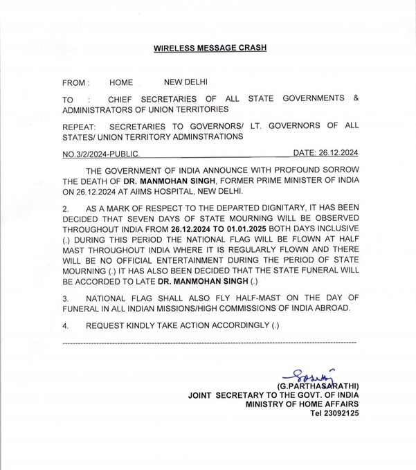 नई दिल्ली: केंद्र सरकार ने पूर्व प्रधानमंत्री मनमोहन सिंह के 26 दिसंबर, 2024 को नई दिल्ली के एम्स अस्पताल में निधन के बाद 26 दिसंबर, 2024 से 1 जनवरी, 2025 तक पूरे देश में सात दिवसीय राजकीय शोक की घोषणा की है। इस दौरान, उन सभी स्थानों पर राष्ट्रीय ध्वज आधा झुका रहेगा, जहाँ इसे पारंपरिक रूप से फहराया जाता है और सभी आधिकारिक मनोरंजन स्थगित रहेंगे।