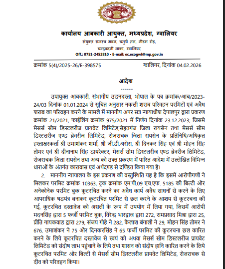 ग्वालियर। नकली शराब परिवहन परमिट और अवैध शराब की आपूर्ति से जुड़े गंभीर आपराधिक मामले में आबकारी आयुक्त, मध्यप्रदेश ने बड़ा प्रशासनिक कदम उठाया है। अपर सत्र न्यायाधीश देपालपुर द्वारा दोष सिद्ध होने के बाद सोम डिस्टलरीज प्रायवेट लिमिटेड, सेहतगंज (रायसेन) एवं सोम डिस्टलरीज एंड ब्रेवरीज लिमिटेड, रोजराचक (रायसेन) के सभी प्रमुख आबकारी लाइसेंस तत्काल प्रभाव से निलंबित कर दिए गए हैं।