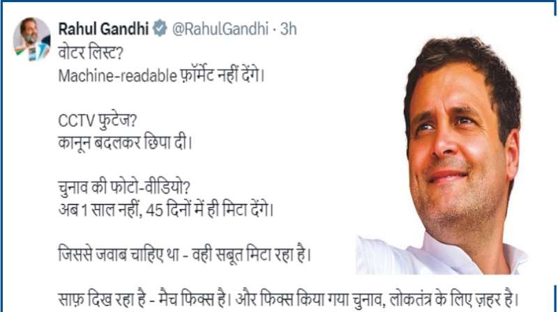 कांग्रेस के वरिष्ठ नेता और लोकसभा में नेता प्रतिपक्ष राहुल गांधी ने शनिवार को चुनाव आयोग की एक हालिया अधिसूचना को लेकर तीखा हमला बोला है. उन्होंने आरोप लगाया कि चुनाव आयोग द्वारा चुनाव से जुड़े इलेक्ट्रॉनिक डेटा और सीसीटीवी फुटेज को जल्द नष्ट करने का निर्देश लोकतंत्र के खिलाफ है और इससे स्पष्ट होता है कि “मैच फिक्स” किया गया है.