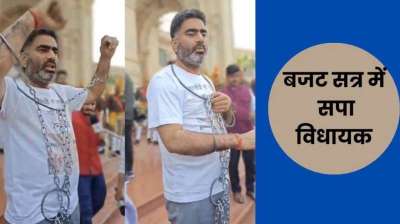 सपा विधायक हाथ पैरों में जंजीर पहनकर प्रदर्शन किया