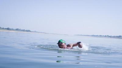 दर्द पर भारी पड़ा जज्बा: 63 की उम्र में नर्मदा में 25.65 किमी तैरकर बनाया नया रिकॉर्ड