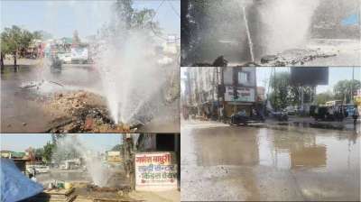 नाला निर्माण के दौरान फूटा अमृत मिशन का पाइप, हजारों लीटर पानी बहा सडक़ पर